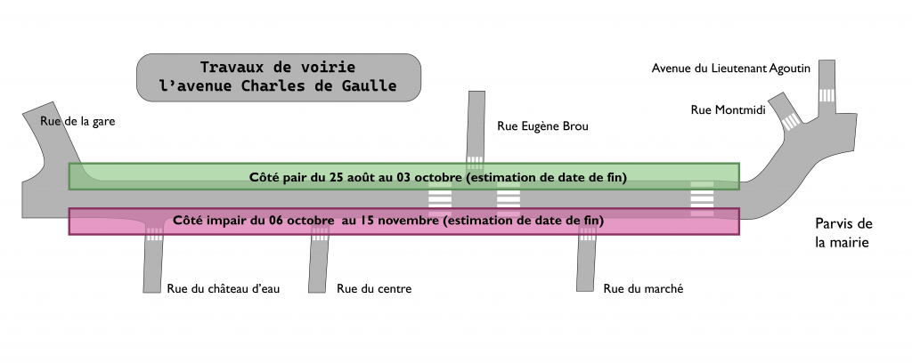 Les travaux de voirie ont débuté le 25 août côté pair depuis la rue de la gare (dans la continuité du nouveau du cheminement piéton lié au travaux du pôle gare) en direction de l’avenue du L. Agoutin. La fin est estimée au 03 octobre (hors intempéries).